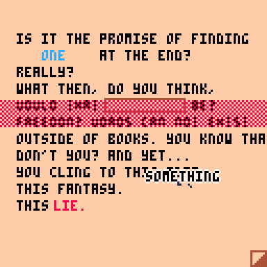 Oh, that's really interesting. You've done a really nice job of making the gameplay interesting and making the text meaningful. Obviously just a prototype, but it would be interesting to see what a longer game looks like.